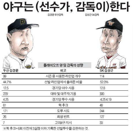 상대 오른손 투수 등판 때 왼손 타자, 왼손 투수 대 오른손 타자를 기용한 플래툰 비율은 SK가 52.0%로 두산의 44.7%를 크게 웃돈다. 데이터상 우위가 발견되면 연봉 5억원인 이호준 대신 왼손 대타 요원 이재원을 서슴없이 기용한다. '전원 야구'를 하는 팀답게 SK는 올시즌 300차례나 대타·대주자 작전을 썼다 두산은 229회다. 여기에는 감독 성향 뿐 아니라 백업 선수들의 기량이 뛰어난 팀 구성의 차이도 있다.