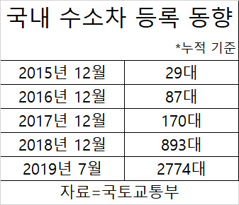 현대차는 틀리지 않았다 = 1일 국토교통부에 따르면 올 들어 7월까지 국내에 등록된 수소차는 2774대로 집계됐다. 올 들어서만 1897대가 보급되며 작년 같은 기간보다 744% 폭증했다. 올해 1000만대를 돌파한 이후 2000만대를 넘어섰다.