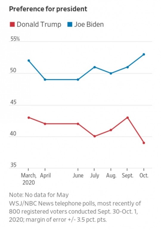 또 월스트리트저널(WSJ)과 NBC가 지난달 30일부터 이달 1일까지 실시해 발표한 조사를 보면 바이든은 53% 지지율로 39%에 그친 트럼프보다 14%포인트나 앞섭니다. 이는 최근 모든 조사를 통틀어 가장 큰 차이입니다. 또 트럼프 대통령의 지지율이 40% 아래로 떨어진 것도 처음입니다.