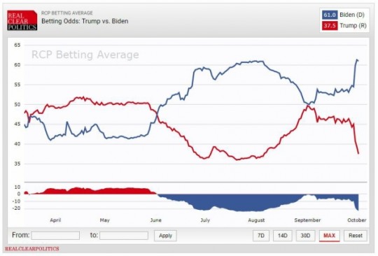 하지만 측근인 크리스 크리스티 전 뉴저지 주지사(비만)도 이번에 함께 감염돼 입원한 것으로 보도되고 있습니다. 그는 과체중으로 어찌될 지 모릅니다. 또 미국의 최근 7일간 일평균 신규 코로나19 환자 수는 차가워지는 날씨와 함께 다시 4만 명대 중반까지 치솟고 있습니다. 과연 이런 상황이 트럼프에게 유리할 지 의문입니다.