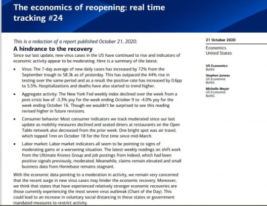 뱅크오브아메리카는 지난 21일 보고서에서 "상승하던 경제 지표가 점차 완만해지고 있다. 우리는 최근의 새로운 바이러스 사례 급증은 경제 회복을 방해할 수 있다는 점을 여전히 매우 염려하고 있다. 게다가 상대적으로 더 강한 경제 회복을 보여온 주들이 현재 가장 심각한 바이러스 감염을 겪고 있다. 이런 주에서는 자발적인 사회적 거리 두기가 증가할 수 있다"고 밝혔습니다.