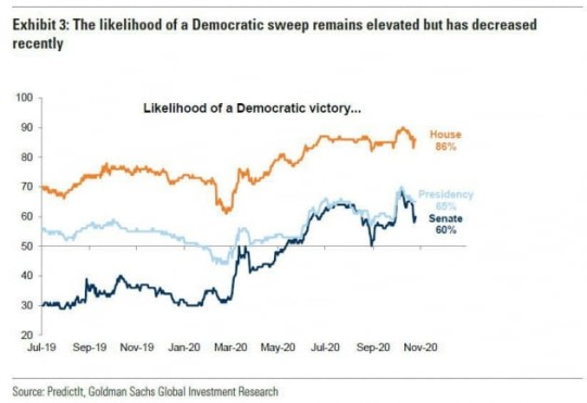 골드만삭스가 이날 "블루웨이브 기대가 섣부를 수 있다"고 경고하고 나섰지만 이는 트럼프의 집권 가능성이 높아진 때문이라기보다는 민주당의 상원 지배 확률이 떨어지고 있다는 데 있습니다.