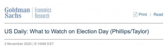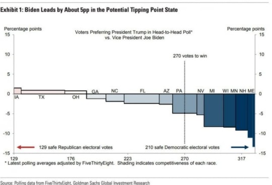 골드만삭스는 "애리조나, 플로리다, 조지아, 노스캐롤라이나에서 바이든이 승리한다면 트럼프 대통령이 투표인단 270명을 모으는 게 어렵게 된다"면서 "이들 주는 모두 일찍 개표 결과를 내놓는 지역이기 때문에 이들 주 결과에 따라 선거일 당일 밤에 당선자가 명확해질 가능성이 있다"고 밝혔습니다.
