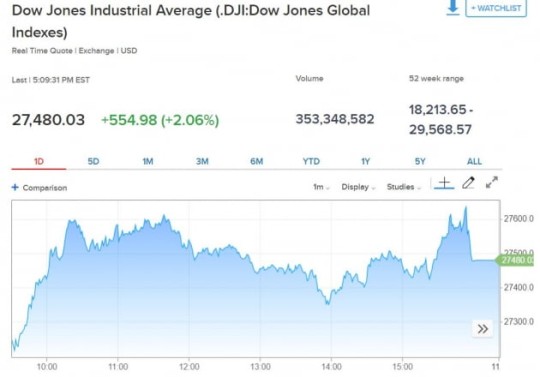 이날 뉴욕 증시에서 다우지수는 554.98포인트, 2.06% 뛰었고 S&P 500 지수는 1.78%, 나스닥은 1.85% 올랐습니다. 장 막판 다우는 한 때 700포인트 넘게 오르기도 했습니다.