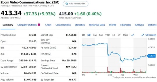 대표적인 게 줌입니다. 지난 이틀간 각각 17%, 9% 떨어졌던 줌은 이날 9.9% 올랐습니다. 좀 떨어졌다고는 하지만 이날 주가는 여전히 올 들어 500% 오른 상태지요. 70달러였던 게 지금 413달러이니까요. 이날처럼 계속 오를 수 있을까요?