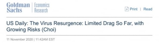이날 연말 S&P 500 지수 목표치를 3600에서 3700으로 올린 골드만삭스는 데일리를 통해 "소비와 고용이 최근 코로나 확산에 대응해 약해지고 있다. 이는 지난 여름 2차 확산 때와는 약간 다르다. 특히 지금의 재확산은 아직 초기 단계이고 신규 감염자와 입원율은 계속 올라갈 것"이라고 경고했습니다.