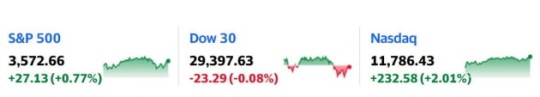 11일(미 현지시간) 뉴욕 증시에선 다우 지수가 0.08% 하락했습니다. 반면 S&P 500 지수와 나스닥은 각각 0.77%, 2.01% 올랐습니다.