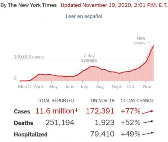 뉴욕타임스에 따르면 18일 미국의 코로나 신규 감염자는 17만2391명, 사망자는 1923명에 달합니다. 미국은 18일자로 사망자가 총 25만명을 넘었습니다. 곧 다시 하루 2000명을 넘길 것 같은데 이는 지난 4월 초 정점 수준입니다.
