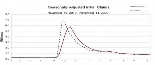 이렇게 코로나가 기승을 부리자 경기 회복세는 꺾이고 있습니다. 이날 발표된 지난 주 실업급여 청구건수는 전주보다 3만1000명 증가해 74만2000명(계절 조정치)을 기록했습니다. 10월 초 이후 처음으로 다시 증가세를 보였습니다. 예상치 71만명보다 훨씬 많았고요. 모하메드 엘에리언 알리안츠 선임고문은 “각 주들이 봉쇄를 강화하기 전인데도 벌써 경기 회복세의 열기가 급격히 빠지고 있다는 걸 뜻한다”고 설명했습니다.