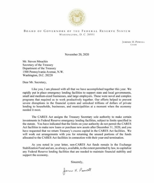 지난 19일 저녁 므누신 재무장관이 Fed의 긴급대출 프로그램들을 연말로 끝낼 것을 요구했다는 뉴스가 나왔습니다. 제롬 파월 의장에게 서한을 보내 "지난 3월 긴급 부양책(CARES Act)에 따라 집행된 자금으로 만들어진 대출기구들이 설립 목표를 명확히 달성했다"며 예정대로 12월31일까지 기구를 정리해 종잣돈 4540억 달러를 반환할 것을 요구한 것입니다.