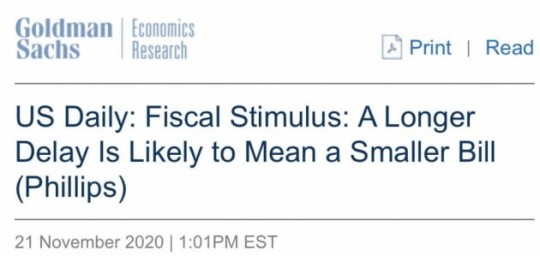 골드만삭스는 "예산안을 논의하면서 양당이 12월26일로 종료되는 팬데믹 실업수당 프로그램 연장 등은 합의할 수 있다"고 내다봤습니다. 하지만 추가 부양책에 대해선 "타결이 연기될수록 (백신 소식 등으로) 부양책 규모는 더 줄어들 것"이라며 내년 1분기 7000억 달러 수준을 예상했습니다.