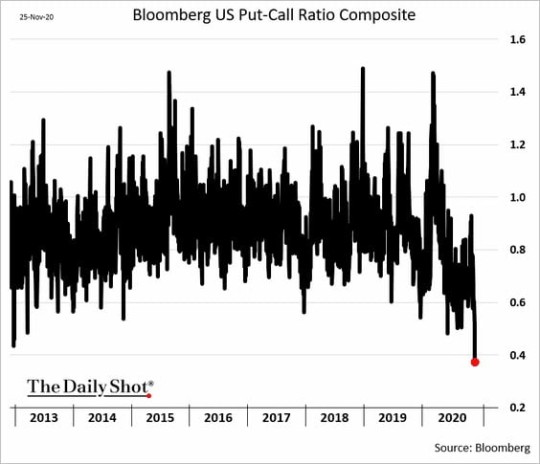 CNN머니가 집계하는 공포와 탐욕지수는 91에 달해 투자심리가 극도의 탐욕 수준에 있음을 나타내고 있습니다. 스코샤뱅크의 패닉/유포리아 지수도 70%를 넘어 희열 단계에 접어들었음을 보여줍니다. 블룸버그가 집계하는 미국 주식옵션 시장의 풋/콜비율은 0.38까지 떨어졌습니다. 향후 주가 하락을 예상하는 풋옵션에 돈을 거는 비율이 콜옵션에 비해 38%에 불과하다는 겁니다.