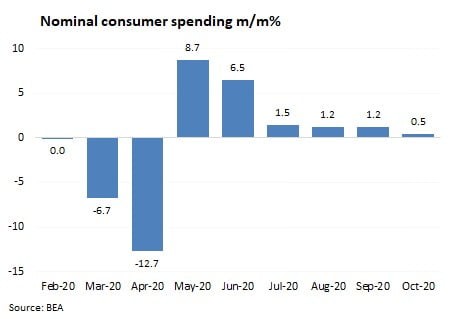 10월 내구재수주는 전월 대비 1.3% 증가해 전월(2.1%)보다 증가폭이 줄었지만, 증가 추세는 유지했습니다. 이는 소비는 여전히 괜찮기 때문에 제조업은 유지되고 있지만, 서비스업은 코로나 재확산에 따른 경제 봉쇄 확대로 타격을 입어 고용이 악화되고 있다고 보면 되겠습니다.