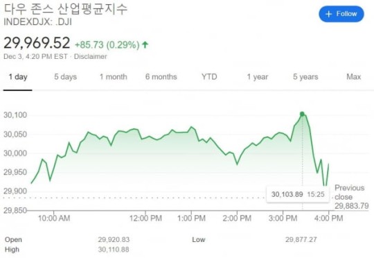 이에 다우는 오후 3시25분께 다시 3만선을 훌쩍 넘어 3만110까지 올랐습니다.