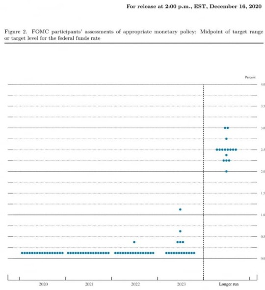 내년에 금리가 오를 것이라고 본 위원은 한 명도 없었습니다. 2022년에 금리가 한 차례 인상될 것으로 본 위원은 한 명이었고, 2023년까지 금리가 한 차례 이상 오를 것으로 본 위원은 다섯 명이었습니다. FOMC 위원이 12명인 걸 감안하면 기본적으로 제로금리를 2023년까지 유지하겠다는 뜻으로 해석할 수 있습니다.