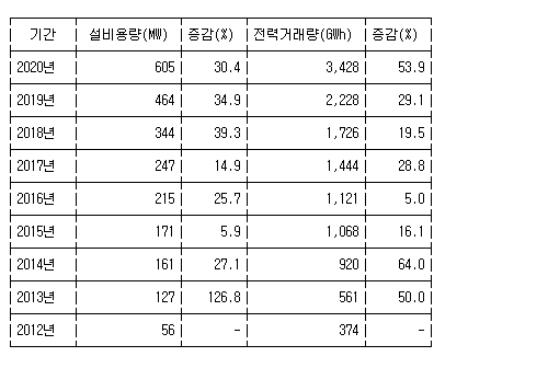 연료전지 설비용량은 2012년 56MW에 불과했으나 연평균 38.1%의 성장세를 보이며 8년 새 10배 이상으로 증가했다.