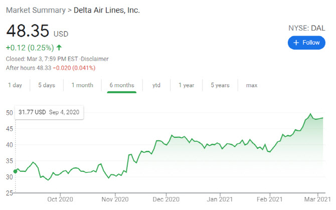 미국을 대표하는 항공사인 델타항공의 최근 6개월 주가 추이. (출처=구글 캡처)