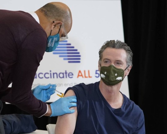 [로스앤젤레스=AP/뉴시스]개빈 뉴섬 미 캘리포니아 주지사가 1일(현지시간) 로스앤젤레스 볼드윈 힐스 크렌쇼 광장에서 얀센(존슨앤드존슨)의 코로나19 백신 접종을 하고 있다. 2021.04.02.
