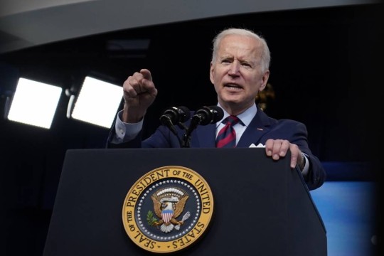 [워싱턴=AP/뉴시스]조 바이든 미국 대통령이 7일(현지시간) 백악관 사우스코트 강당에서 미국의 인프라·일자리 투자 법안에 관해 연설하고 있다.