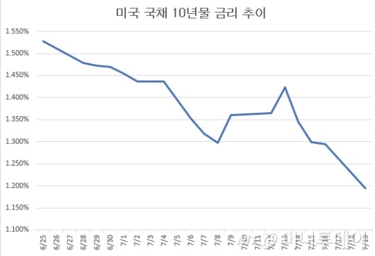 국채금리도 급락했다. 이날 1.294%로 출발한 10년 만기 미국 국채수익률은 1.194%로 하락했다. 10년물 국채금리는 이날 장중 1.182%까지 떨어지며 최근 5개월 최저 수준으로 추락했다가 장 막판 낙폭을 다소 줄였다.