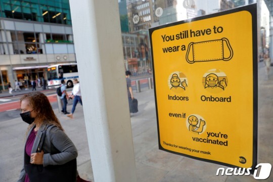 (뉴욕 로이터=뉴스1) 이정후 기자 = 2일(현지시간) 미국 뉴욕의 지하철역 입구에 마스크 착용을 권고하는 안내 문구가 붙어 있다. 미국 내에선 최근 델타 변이의 확산으로 마스크 쓰기 정책을 다시 펼치고 있는 곳이 늘고 있다. (C) 로이터=뉴스1