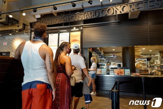 (플로리다 AFP=뉴스1) 구진욱 기자 = 11일(현지시간) 미국 플로리다주 마이애미 비치에서 시민들이 쉐이크 쉑을 방문하고 있다. 쉐이크 쉑은 2021년 남은 3개월 동안 음식값을 3~3.5% 올릴 계획이다. 줄어드는 코로나바이러스감염증(코로나19) 팬데믹의 영향으로 미국 소비자들은 계속해서 높은 물가 상승에 직면하고 있다. (C) AFP=뉴스1