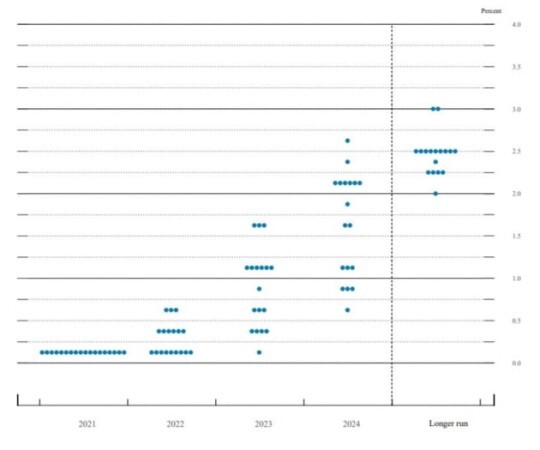 지난 6월에는 2023년에 두 번 기준금리를 올릴 것으로 예상했지만, 이번에는 세 번 인상할 가능성을 제시했다. 또 2024년까지는 정책금리를 총 여섯 번 올릴 것으로 전망했다. 이렇게되면 2024년 말 Fed의 기준금리는 1.5~1.75%로 상승하게된다.