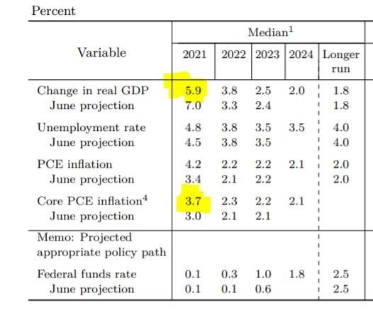 FOMC는 경제전망(SEP)을 통해 올해 경제성장률은 지난 6월에 제시했던 7.0%에서 5.9%로 낮췄다. 인플레이션의 경우 근원 개인소비지출(PCE) 물가를 기준으로 6월에 제시한 3.0%를 3.7%로 높였다. 즉 성장률은 낮추고 인플레이션 전망치는 높인 것이다.