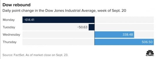 증시에서는 다우 지수가 1.48% 올랐고 S&P 500은 1.21%, 나스닥은 1.04% 상승했습니다. 다우는 한때 621포인트, 거의 2% 근처까지 급등하기도 했습니다. 지난 7월 20일 이후 두 달 만에 가장 많이 오른 날이었습니다. 다우는 이번 주 초반 하락 폭을 모두 만회하고 주간 단위로 플러스로 돌아섰습니다.