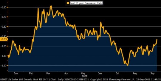 또 채권시장에서는 국채 10년물 금리가 급등했습니다. 안전자산인 채권 가격이 대폭 내린 겁니다. 전날엔 단기물 금리만 오르고, 장기물은 내리면서 수익률 곡선이 평평해졌었습니다. 하지만 이날 장기물 금리가 급등해 수익률 곡선은 가팔라졌습니다. 월가 관계자는 "Fed의 테이퍼링 발표에도 경기 회복세가 지속할 것이란 믿음, 테이퍼링이 시작되면 채권 수요가 줄어들 가능성, 또 2022년 말 기준금리 인상 가능성 등이 영향을 준 것으로 본다"라고 해석했습니다. 이런 가능성을 반영해 이날 실질금리도 상당폭 상승했습니다.