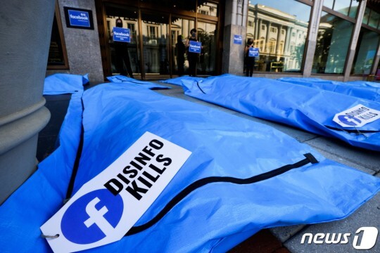 (워싱턴 로이터=뉴스1) 이정후 기자 = 28일(현지시간) 미국 워싱턴 페이스북 지사 앞에서 코로나19 허위 정보를 규제하지 않는 페이스북에 항의하기 위해 시위대가 시체 가방을 전시하고 있다. (C) 로이터=뉴스1페이스북은 최근 가동 중단 사태와 내부고발자의 의회 증언에도 불구하고 이날 주가가 2.06% 상승했다.