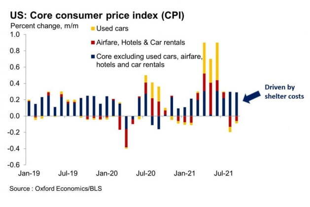지속적인 물가 요인인 임대료가 올라가기 시작하면서 근원 소비자물가(CPI)가 더 올라갈 수 있다는 겁니다. 임대료에서 많은 부분을 차지하는 주택소유자의 등가 임대료(OER)은 지난 9월 지난해 같은 기간보다 2.9% 증가했지만, 내년까지 가속화될 것이란 예상입니다. 그래서 근원 CPI는 내년 말까지도 3.1%에 달할 것으로 봤습니다.