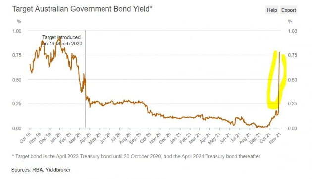 국채 3년물 금리를 2024년 4월까지 연 0.1%로 유지하고 2023년 말까지 금리를 인상하지 않겠다고 선언한 상태인데, 이 채권의 금리가 지난주 시장에서 연 0.75%까지 치솟았습니다. '높은 인플레이션 탓에 RBA가 금리를 올릴 수밖에 없을 것'이란 베팅이 폭증한 탓입니다.