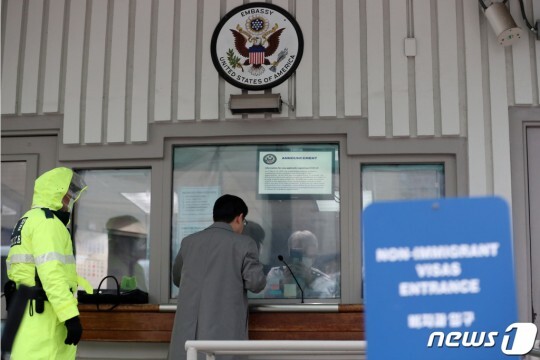 (서울=뉴스1) 박세연 기자 = 8일 서울 종로구 주한 미국대사관에서 시민이 미국 입국을 위해 비자를 신청하고 있다. 이날부터 미국이 신종 코로나바이러스 감염증(코로나19) 백신 접종을 완료한 외국인을 대상으로 20개월만에 국경을 전면 재개방한다. 국경 개방 조치는 바닷길을 제외한 육지와 항공길에 한정된다. 앞서 제프 자이언츠 미 백악관 코로나19 조정관이 외국인 입국 관련 백신 접종 의무화 논의를 진행하고 있다고 밝힌 지 3개월만이다.