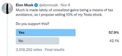 반면 테슬라 주가는 4.85% 하락 마감했다. 테슬라의 일론 머스크 최고경영자(CEO)는 지난 주말 트위터를 통한 여론조사를 통해 보유주식에 대한 미실현 이익 차익에 세금을 부과하려는 정치권의 움직임에 대해 자신의 주식 10%를 매각할 지 여부를 물었고, 응답자의 58%는 '그렇다'고 응답했다.