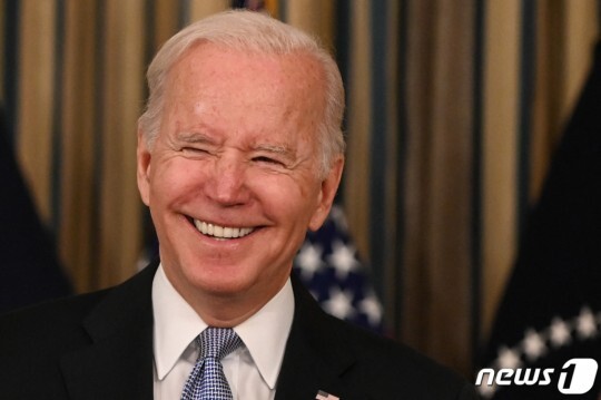 (워싱턴 AFP=뉴스1) 우동명 기자 = 조 바이든 미국 대통령이 6일(현지시간) 워싱턴 백악관에서 초당적 인프라 예산법안의 하원 통과 관련 연설을 하며 활짝 웃고 있다. (C) AFP=뉴스1