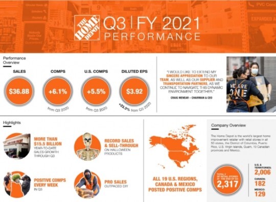 홈디포의 2021년 3분기 실적 현황 /사진=홈디포 홈페이지월마트와 홈디포는 인플레이션에 따라 소비자의 구매력이 위축되고 있지만, 가계의 수요가 크게 증가하고 있다고 밝혔다.
