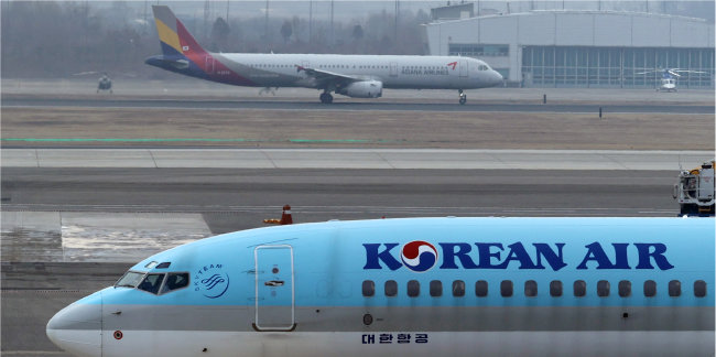 2021년 12월 29일 서울 김포공항 계류장에서 대한항공과 아시아나항공 소속 여객기가 이륙 준비를 하고 있다. 공정거래위원회는 이날 대한항공의 아시아나항공 인수합병 ‘조건부 승인’ 결정을 내렸다. [뉴스1]