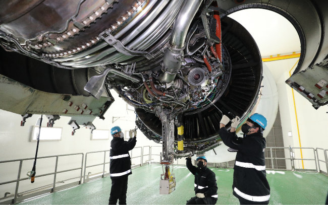 2021년 12월 27일 인천 중구 영종순환로 대한항공 엔진 테스트셀에서 정비사들이 항공기 엔진을 정비하고 있다. 대한항공과 아시아나항공 외에는 대형 항공기 관리 역량을 가진 항공사가 없다. [뉴스1]