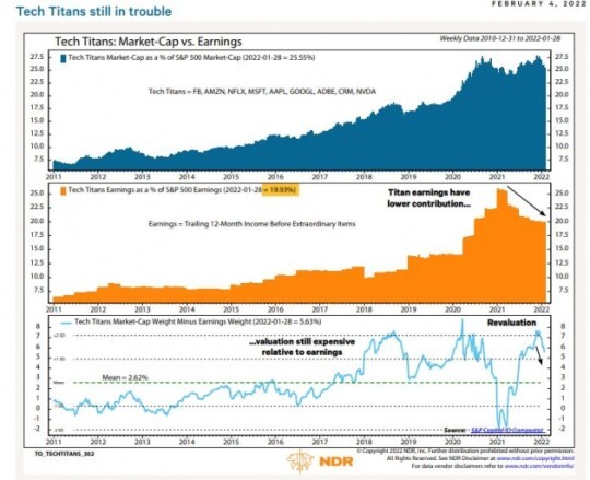 네드데이비스 리서치는 이날 “거대기술주들은 여전히 문제가 있다”(Tech titans still in trouble)이라는 제목의 보고서를 내고 이들의 이익은 둔화하고 있는데, 가치는 상대적으로 높다고 지적했습니다. 과거에는 S&P500 기업 이익의 25%를 차지했는데, 이 비율이 20% 미만으로 줄어들었다는 겁니다.