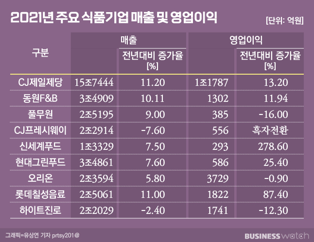 업계 관계자는 "결과만 놓고 보면 코로나19는 식품업계에게 위기라기보다 기회였다. 대부분 기업이 맞춤형 전략을 수립해 바뀐 시장에 적응하고 외형 성장을 이뤄냈다"며 "올해는 가격인상 효과 등도 본격적으로 반영될 것이니 수익성도 개선될 것으로 보인다. 다만 국내 시장 규모에 한계가 있는 만큼, 매출을 더 성장시키려면 해외를 비롯한 신시장을 꾸준히 개척해야 할 것"이라고 말했다.