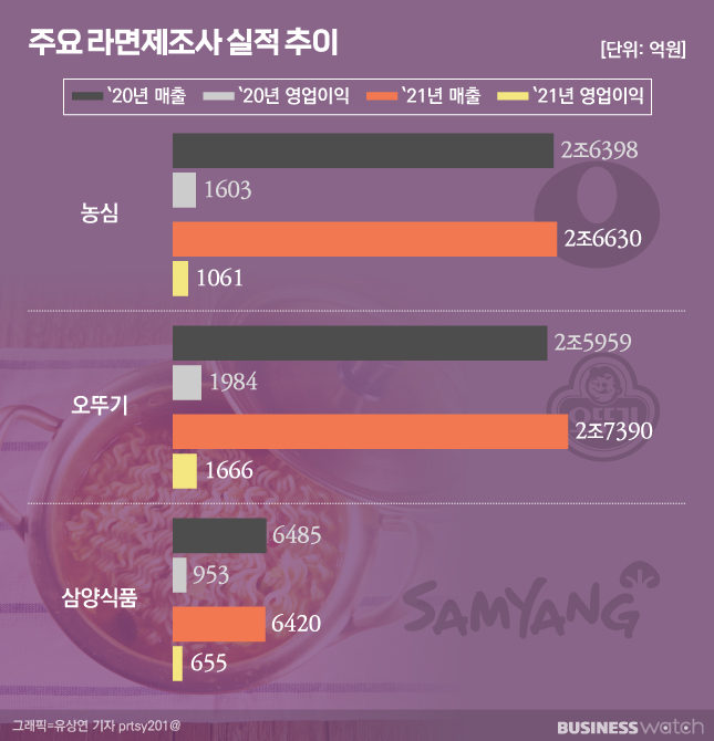 업계에서는 2020년의 역기저효과를 저조한 실적의 이유로 꼽는다. 실제로 2020년은 라면업계의 황금기였다. 코로나19 팬데믹 초기 소비자들이 생수·라면 등 비축식품 사재기에 나섰다. '짜파구리'가 등장한 영화 '기생충'이 아카데미상을 받으며 라면을 새롭게 즐기는 방법도 주목받았다. 이에 힘입어 대부분 라면업체가 역대급 실적을 기록했다. 때문에 지난해 실적이 줄어든 것처럼 보이는 착시효과가 발생했다는 이야기다.