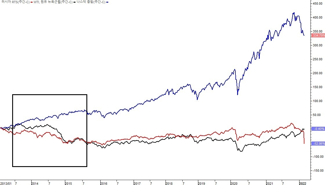 당시 RTS지수와 WTI 그리고 나스닥 흐름 봅니다.