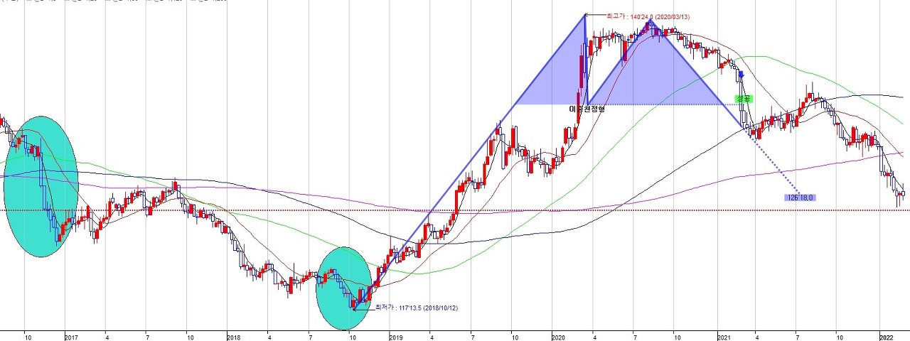 왼쪽 표시한 박스권의 흐름을 주목합니다.