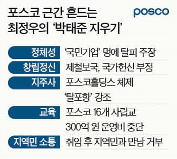 포스코의 근간이 흔들리고 있다. 최정우 포스코그룹 회장의 무리한 ‘박태준 지우기’ 시도 때문이라는 분석이 나온다. 지주사 체제 전환으로 홍역을 치렀던 포스코는 정체성마저 부정하며 혼란을 가중시키고 있다.