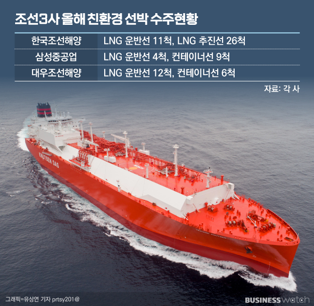 19일 업계에 따르면 올해 초부터 최근까지 조선3사가 수주한 선박 가운데 액화천연가스(LNG) 운반 및 LNG 추진·이중연료 등 친환경 선박은 70척에 달한다. LNG 운반선은 27척, LNG·이중연료 추진선은 41척 수준이다. LNG 운반선도 대부분 친환경 연료로 추진되는 선박이다.