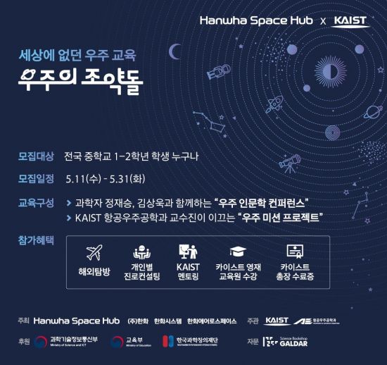 한화 스페이스 허브와 카이스트가 우주에 관심 있는 중학생들을 대상으로 한 영재 육성 프로젝트인 '우주의 조약돌'을 시작한다고 9일 밝혔다.