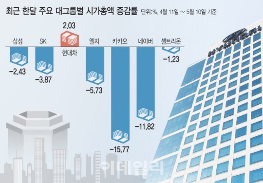 최근 한 달 현대차그룹, 유일하게 시총 되려 늘어 올해 맥 못추던 대형주, 대외 악재 방어력에 주목해야 “실적과 밸류에이션 지지력, 대형주 관심 필요”
