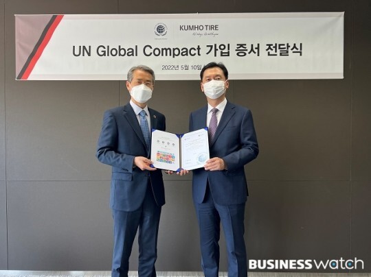 금호타이어가 유엔글로벌콤팩트(UN Global Compact, 이하 UNGC)에 가입하며 ESG경영 강화에 나섬. 최근 서울 광화문 본사에서 정일택 금호타이어 대표이사 사장과 권춘택 UNGC한국협회 사무총장 등이 참석한 가운데 UNGC 가입 증서 전달식을 진행.