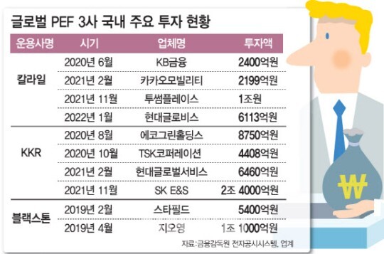 [이데일리 김성훈 기자] 글로벌 3대 경영참여형 사모펀드(PEF) 운용사인 블랙스톤(Black Stone)과 콜버그크래비스로버츠(KKR), 칼라일(Carlyle) 그룹이 국내 투자를 본격화하고 있다. 수천억 원에서 많게는 조 단위 투자를 서슴지 않는 한편 8년 만에 국내 시장 재상륙을 선언하며 국내 공략에 나선 것이다.